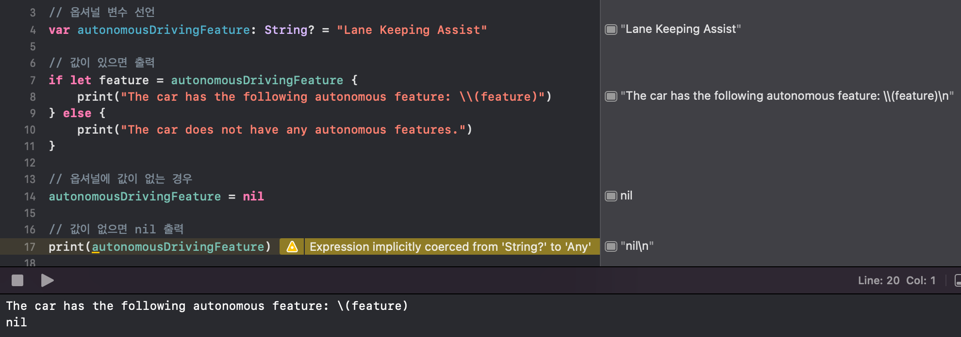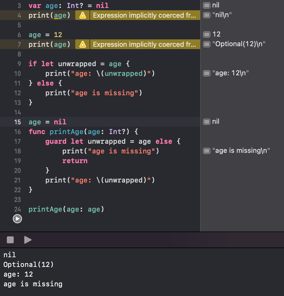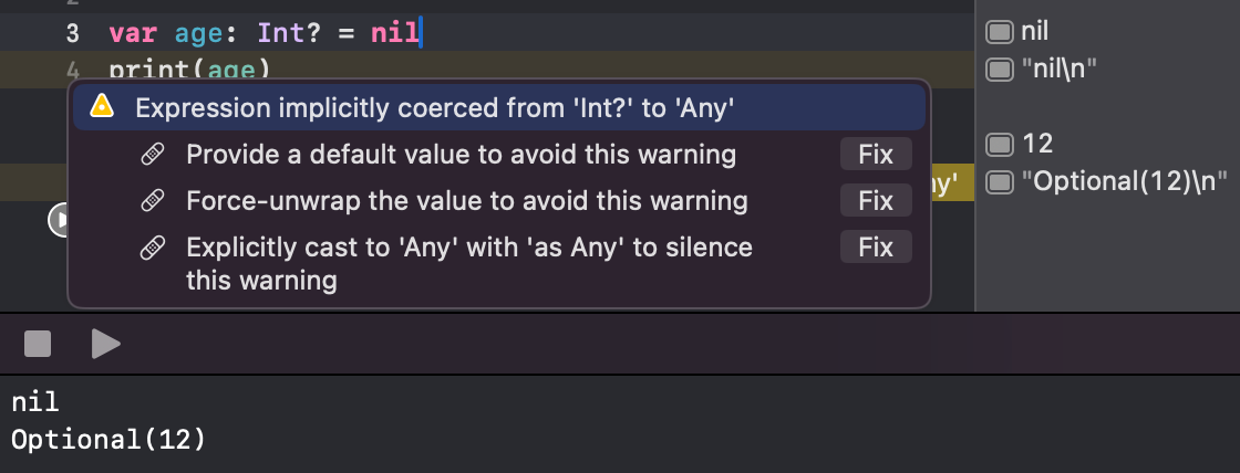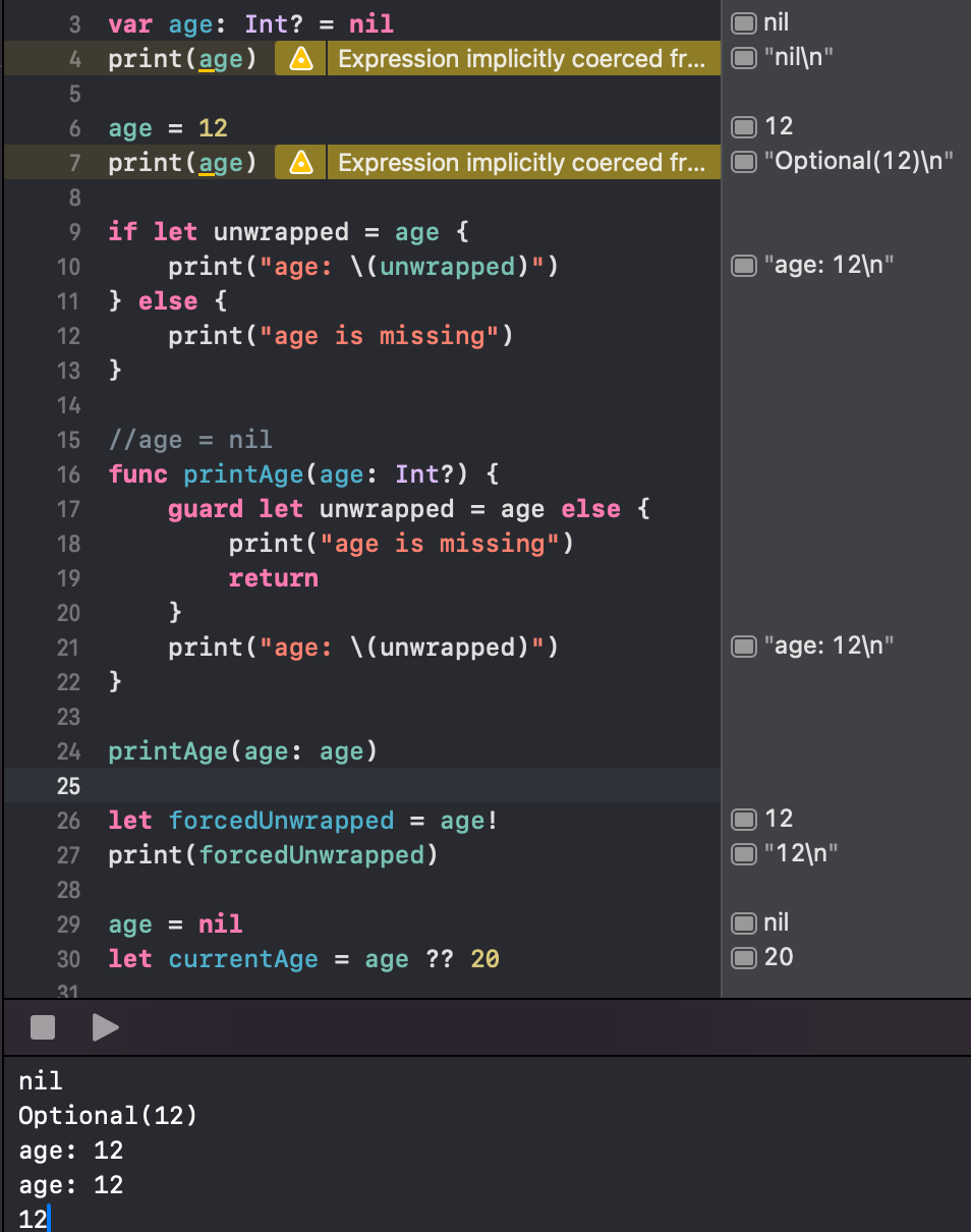 Nil Coalescing : optional 타입에 값이 있을 때는 해당 값을 넘겨주면 되고, optional 타입에 값이 없는 경우 default 값을 설정하고 싶을 때 nil coalescing을 이용할 수 있다. ?? 를 이용해서 default 값 설정.