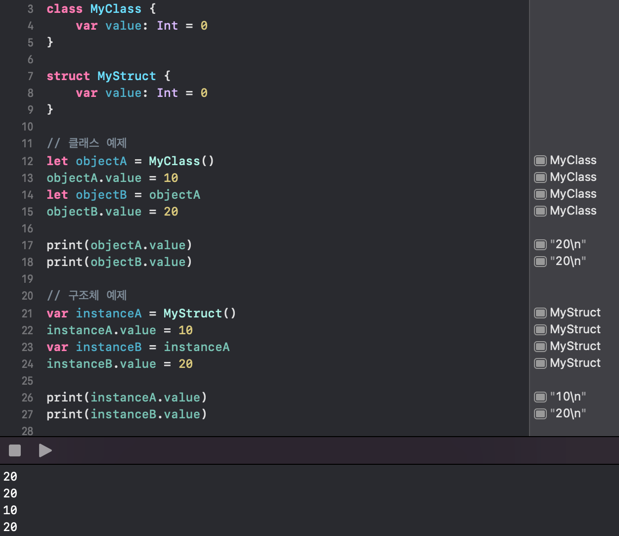 위 예제에서 클래스의 경우 objectA와 objectB는 동일한 인스턴스를 참조하므로, objectB에서 값을 변경하면 objectA의 값도 변경된다. 반면 구조체의 경우 instanceA와 instanceB는 독립적인 값을 갖기 때문에 instanceB에서 값을 변경해도 instanceA의 값에는 영향을 주지 않는다. 이처럼 swift의 class와 struct는 사용 방식과 동작 방식에 따라 적절하게 선택해 사용해야 한다.