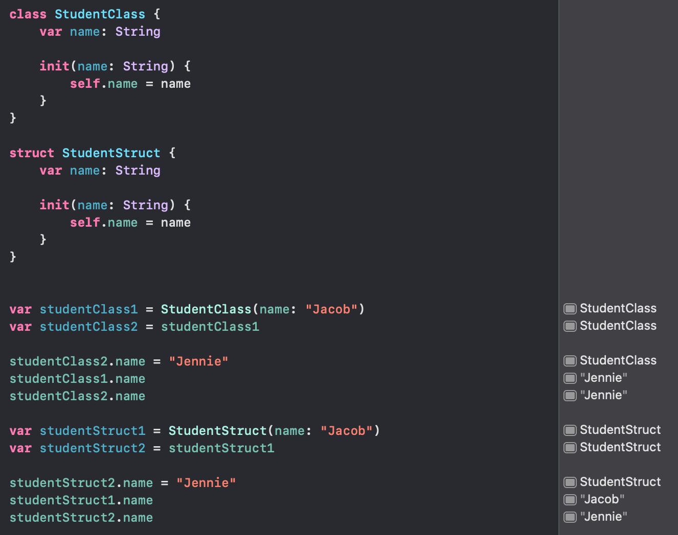 copying object : struct 와 class 의 차이중 하나가 instance 복사할때인데, struct 와 같은 value type 은 복사하면 새로운 객체를 만든다. 따라서 새로 복사된 객체의 프로퍼티 변형했다고 원래 객체가 영향 받지 않는다. 하지만 class 와 같은 reference type 은 복사하면, 새로운 객체를 만들지 않는다. (같은 객체를 포인팅하고 있음) 따라서 새로 복사된 객체의 프로퍼티를 변형하면, 원래 객체의 프로퍼티는 영향을 받아서 변형 되어 있다.