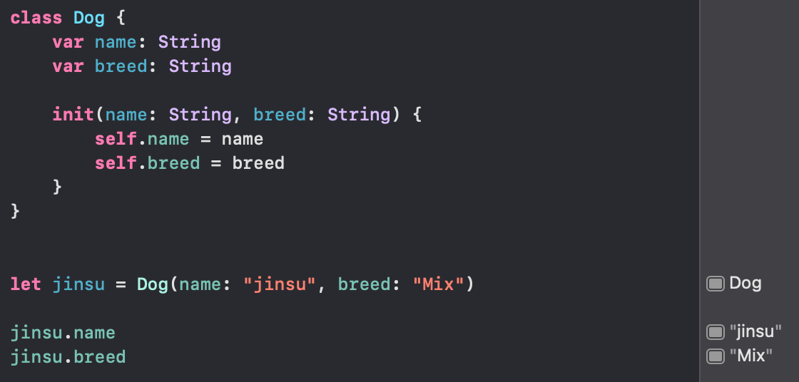 - 참조 타입(reference type) : 클래스는 참조 타입이다. 참조 타입이란, 변수나 상수에 값을 할당하거나 함수에 인자로 전달될 때 그 값이 복사되지 않고 참조된다는 의미. 클래스를 객체로 만들면 해당 객체의 참조가 변수나 상수에 할당된다. 여러 변수가 같은 객체를 참조할 수 있다. 할당 또는 파라미터 전달 시에 객체를 가리키고 있는 메모리의 주소 값이 복사된다.