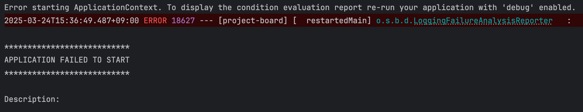 이 오류 메시지는 Spring 애플리케이션이 시작될 때 ApplicationContext 가 로드되지 않았다는 의미이다.