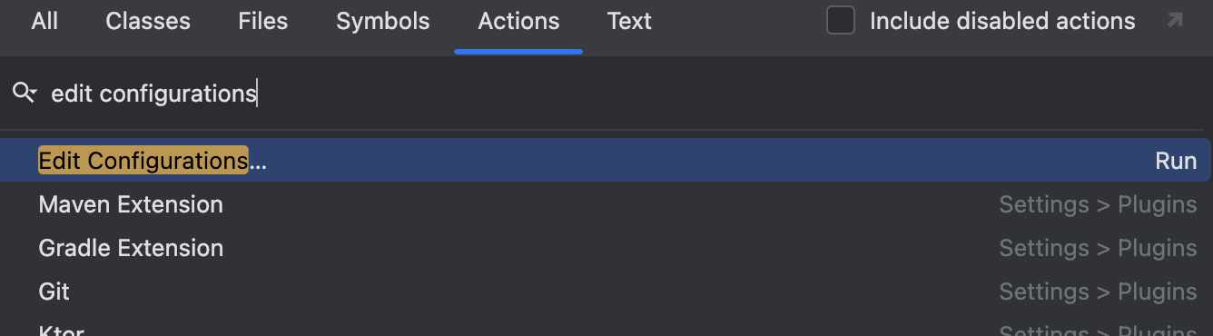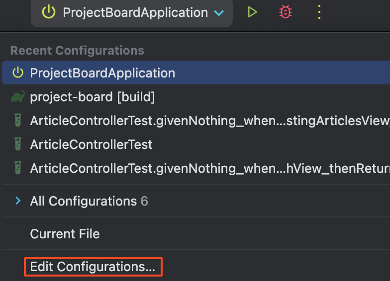Mac 단축키 cmd + shift + a 를 눌러 Edit Configurations를 검색하여 빠르게 접근도 가능하다.