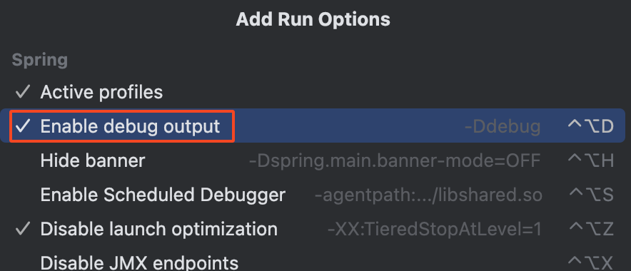 Intellij IDEA > Run > Edit Configurations > Modify options > Enable debug output 체크