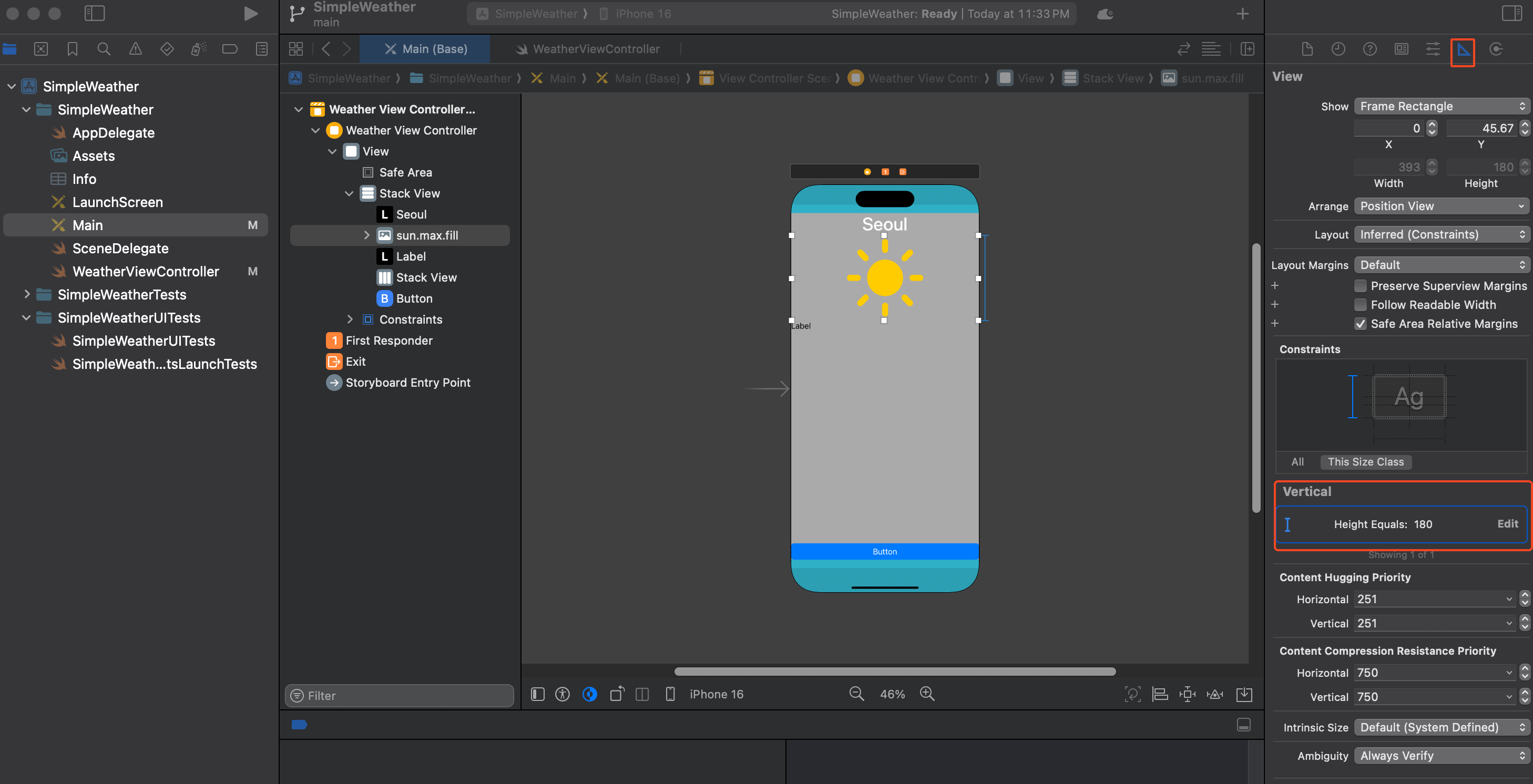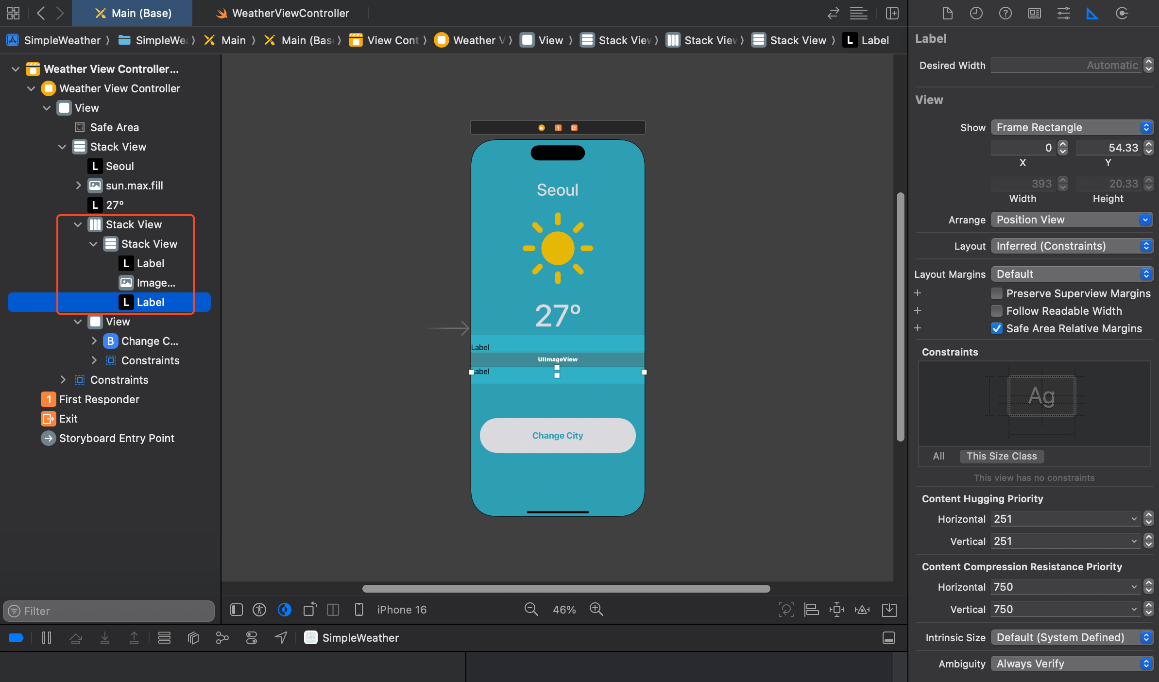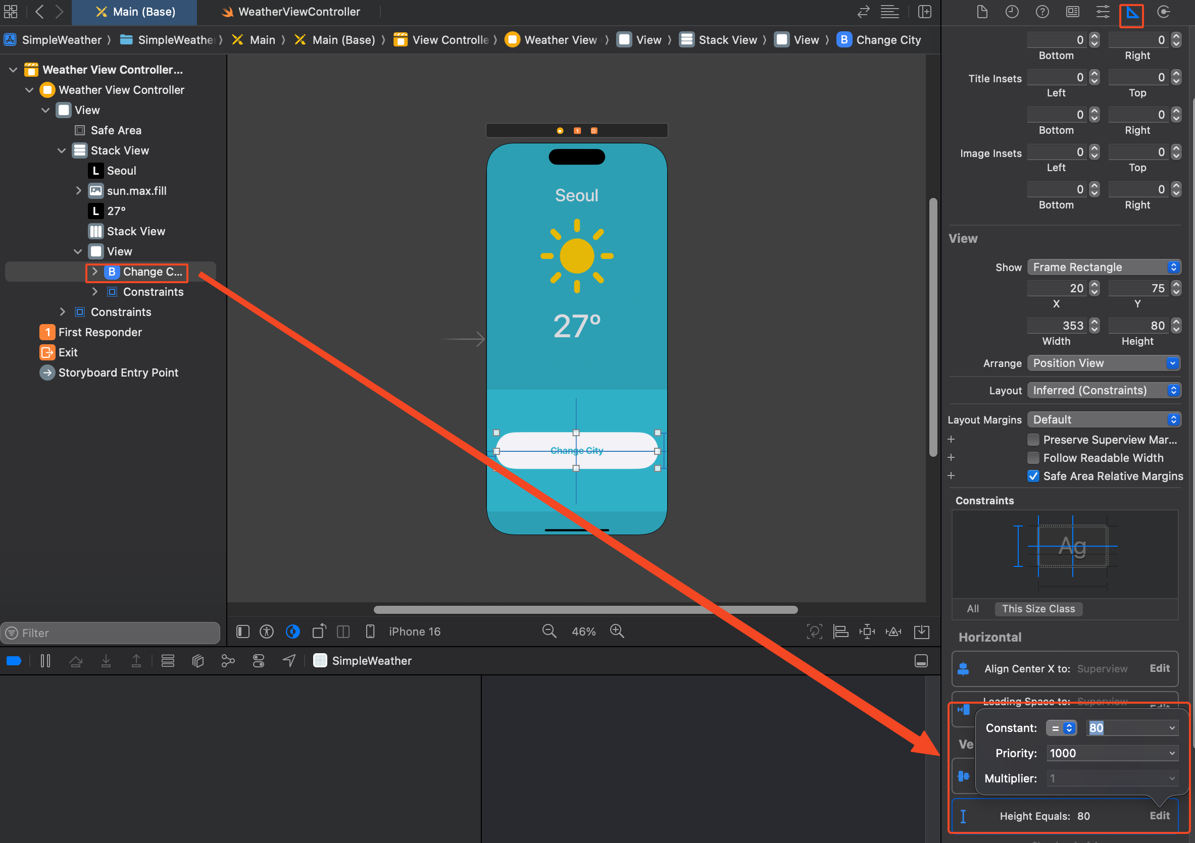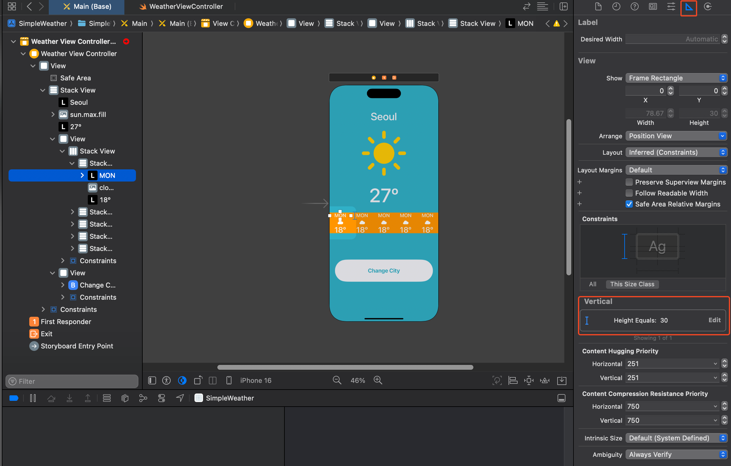 웨더 이미지의 사이즈는 변경하고 싶은 이미지뷰를 클릭 > Ctrl(⌃)누른 상태에서 마우스를 끌어주면(드래그 앤 드롭) 오토레이아웃 constraints를 정해줄 수 있다. 해당 높이를 설정하고, 현재의 사이즈대로 높이가 잡힌 것을 확인 후 원하는 높이로 사이즈 변경.