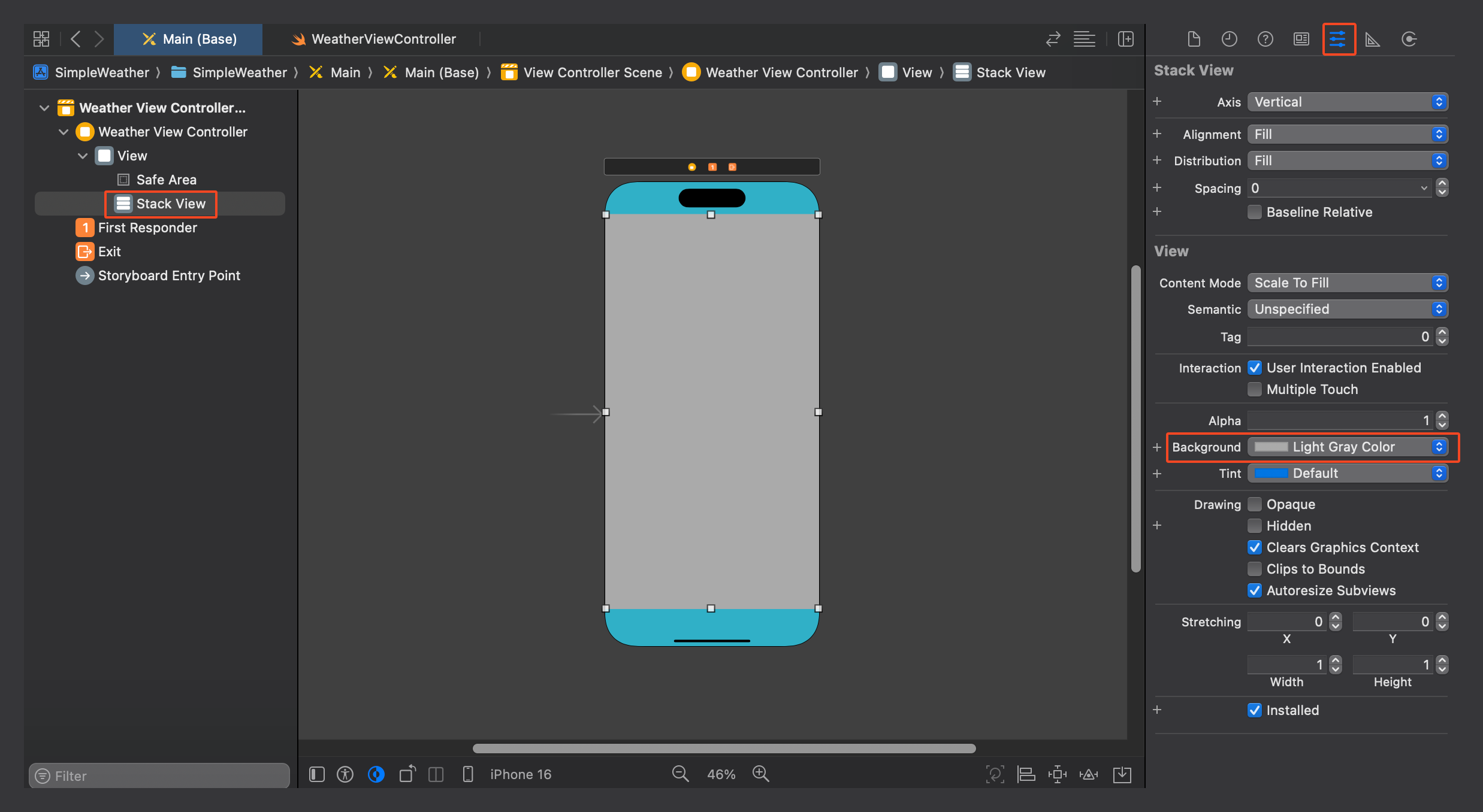 시뮬레이터로 돌렸을 시 버튼의 위치가 높아 위치를 변경해 주고, 스택 뷰의 불필요한 백그라운드 컬러를 변경한다.
