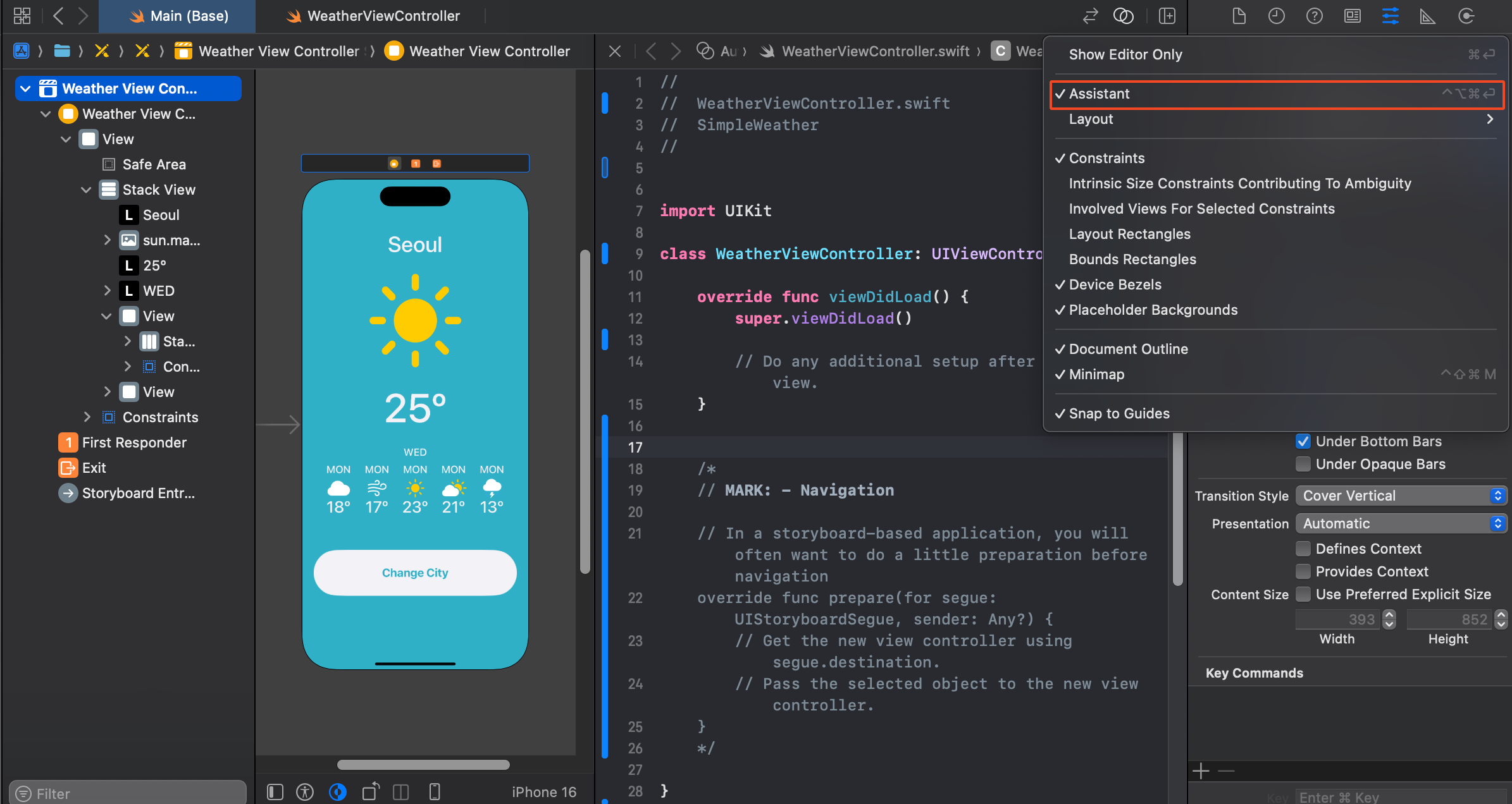 실제 로직을 구현 시 도시를 표현하는 레이블, 날씨를 표현하는 이미지뷰, 온도를 표시하는 레이블들을 실제로 사용되는 UI 컴포넌트를 코드에 연결할 때 같은 방식으로 클릭 > Ctrl(⌃)을 누른 채로 코드에 끌어 @IBOutlet으로 연결해 준다.
