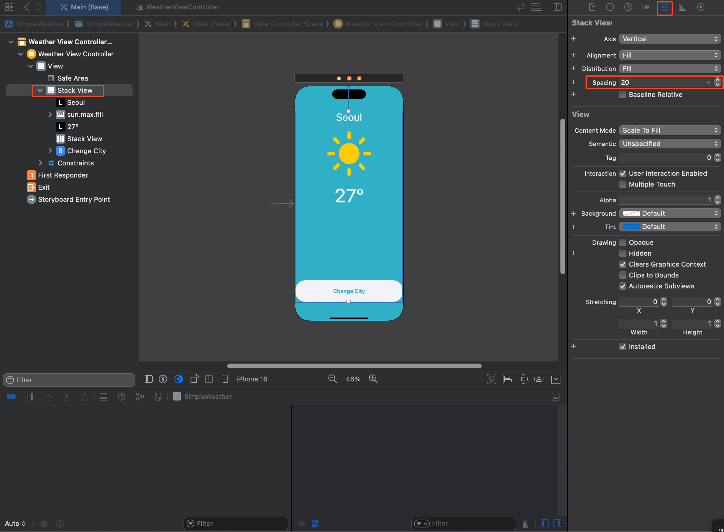 시뮬레이터로 돌려 봤을 때 레이블과 이미지 등 간격이 다소 상단으로 몰려 있으므로 해당 간격을 조절하기 위해 스택 뷰안 아이템들 간의 간격을 Spacing으로 조절해 준다.
