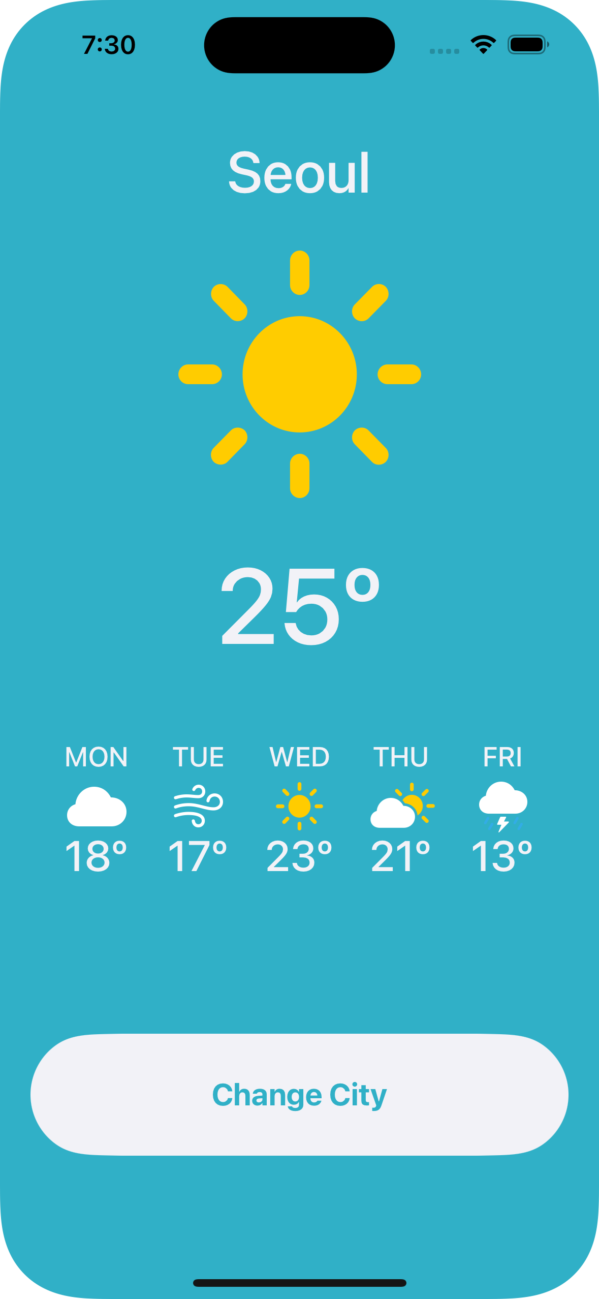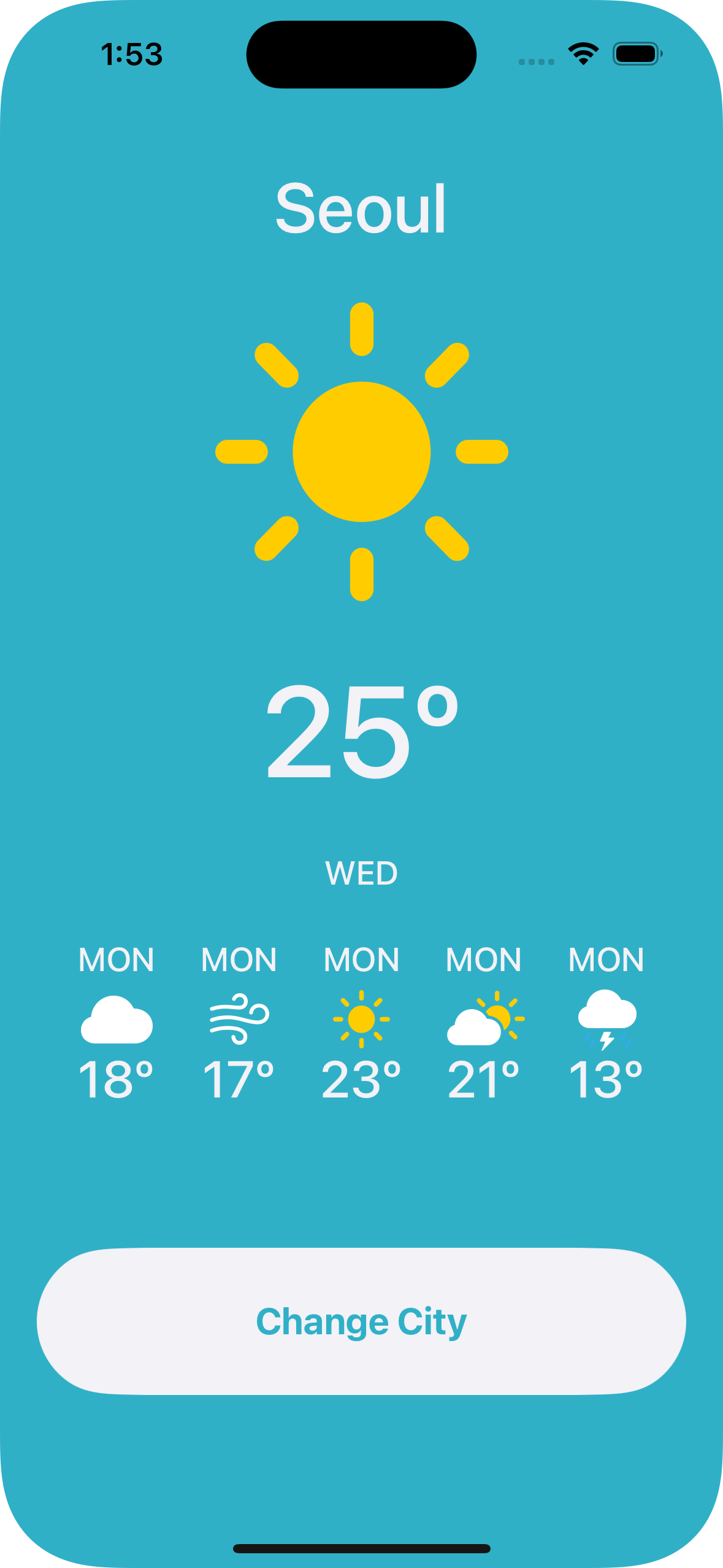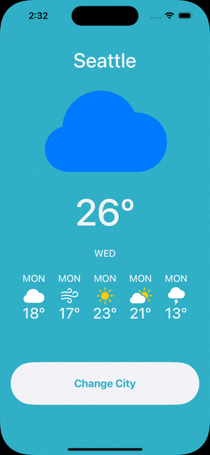 UIKit의 여러 UI Component와 Auto Layout를 이용하여, 버튼을 누르면 도시의 날씨, 온도 등을 보여주는 간단한 날씨 앱 만들기.