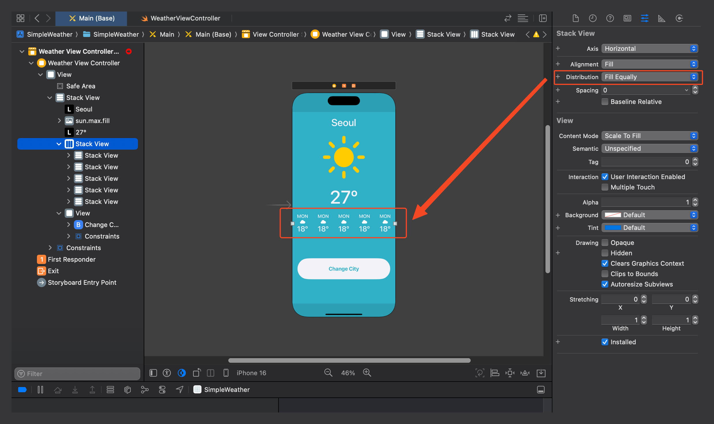스택 뷰를 똑같이 분배하고 싶을 시 Distribution을 fill > fill Equally로 변경하면 균등하게 분배되는 것을 볼 수 있다.