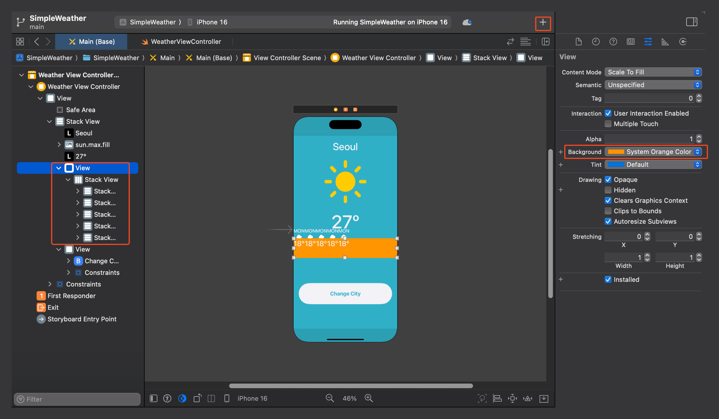 화면 중앙의 큰 부분을 차지하는 스택 뷰안의 컴포넌트들인 도시와 날씨, 온도가 버튼을 클릭 시 랜덤으로 변화하도록 하는 부분의 로직을 실제 코드랑 스토리보드를 연결해서 구현.