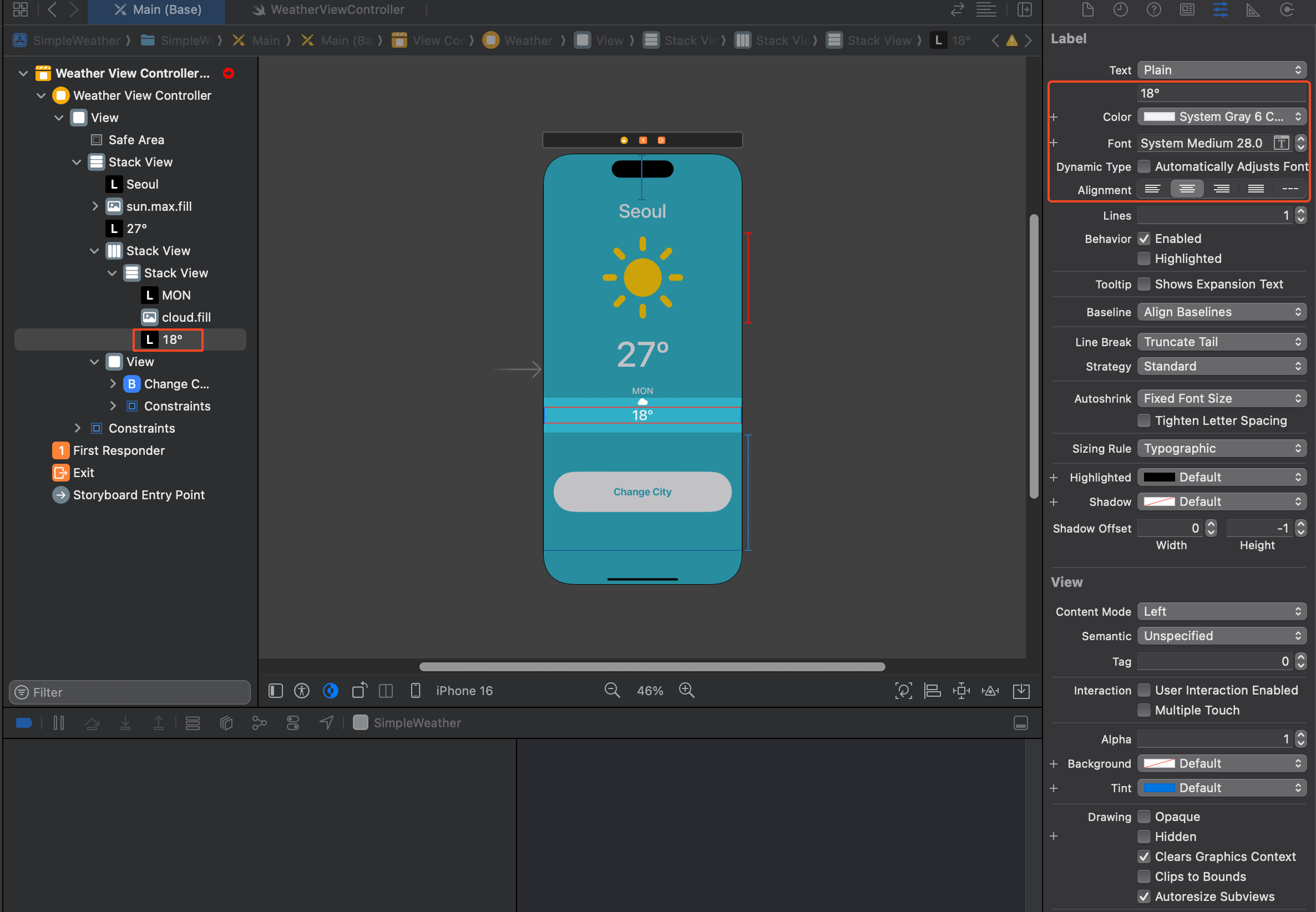 온도를 나타내는 레이블의 이름으로 온도와, 색상, 크기와 가운데 정렬로 맞춘 후, 27 º 도같은 온도 표현이나 특수문자 삽입 시 macOS에서 단축키 Ctrl(⌃) + Cmd(⌘) + Space를 누르면 이모지 및 특수기호를 선택할 수 있는 팝업이 열린다. 여기에서 다양한 기호, 심볼, 이모지를 선택하여 Xcode에 입력할 수 있다.