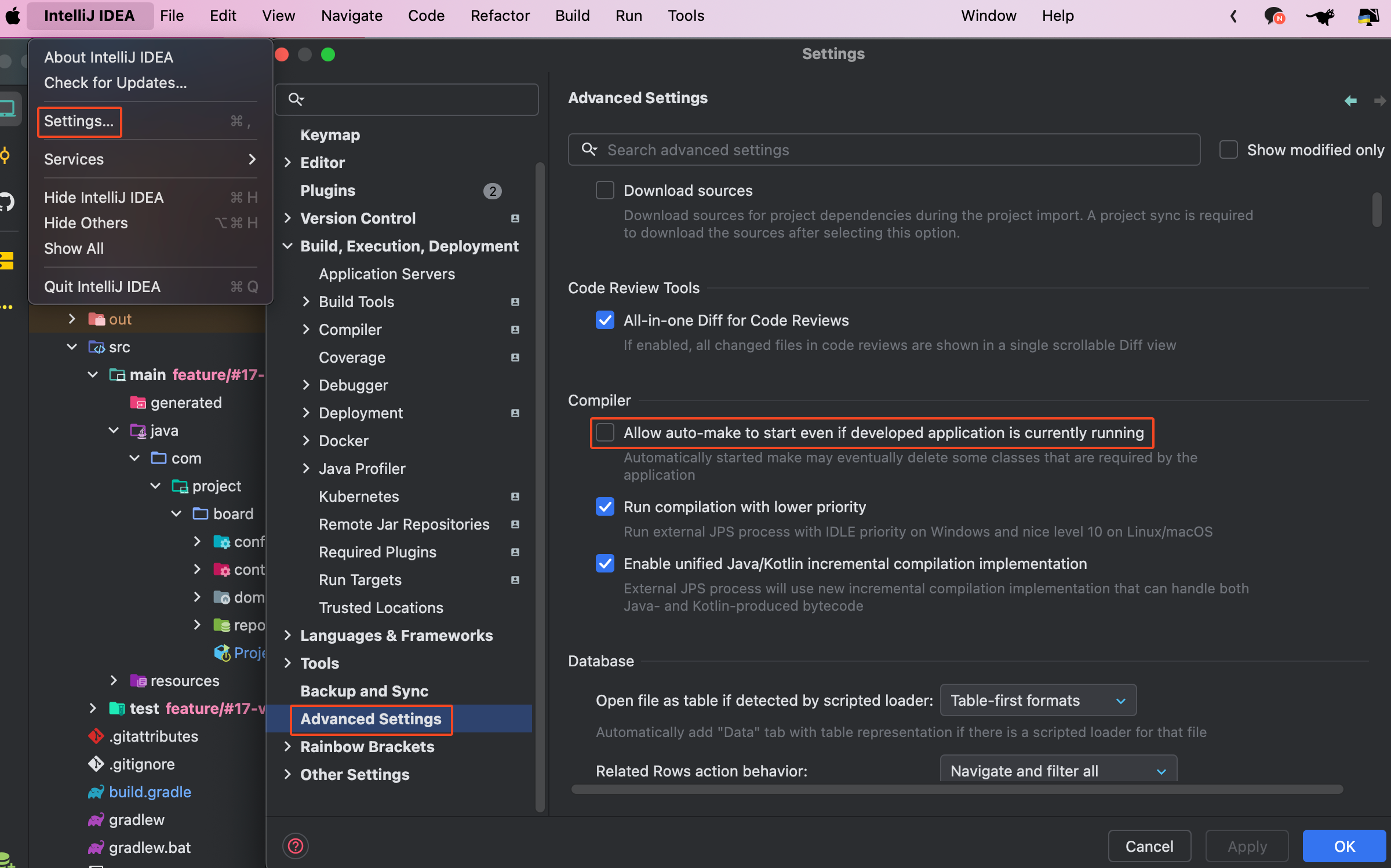 단축키 cmd + shift + a > Actions > Registry 입력 후 선택 > compiler.automake.allow.when.app.running 체크 및 기능 활성화.
