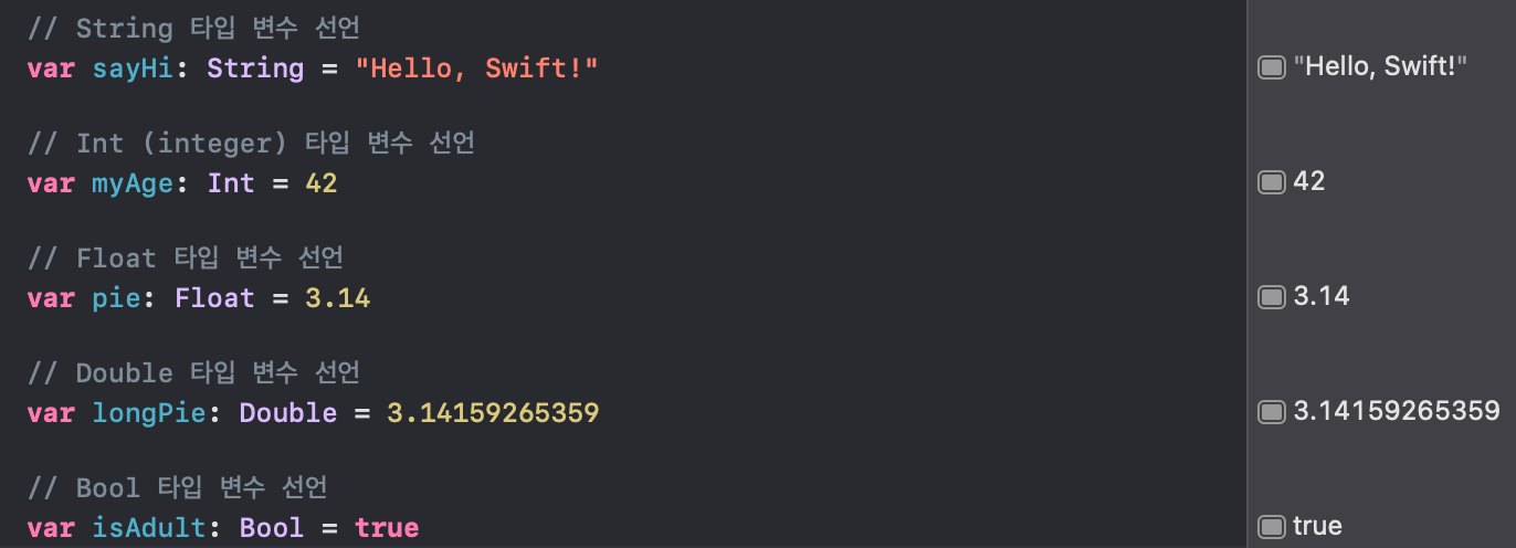 변수의 타입 : Swift는 타입 추론을 통해 변수나 상수의 타입을 자동으로 판단한다. 그러나 명시적으로 타입을 지정할 수도 있다.